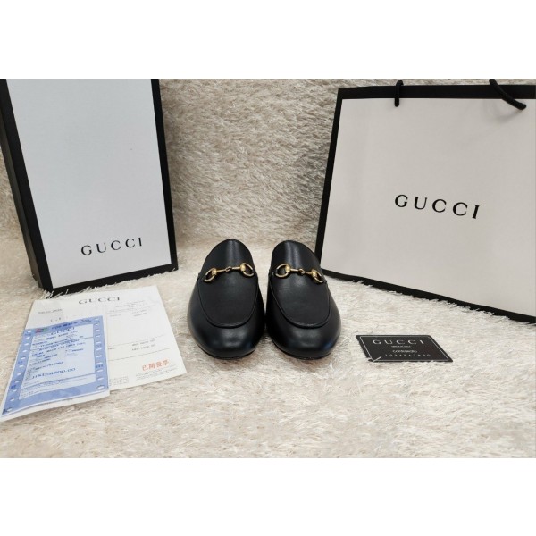 G*ucci(구*찌)의 프린스타운 슬립온은 블랙 색상의 가죽 소재로 제작되었으며, 골드 톤 호스빗, 가죽 솔 디자인, 브랜드 로고가 새겨진 안창이 특징입니다.