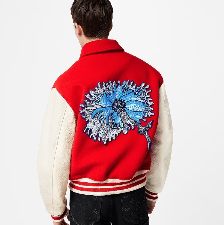 루이비통 x 야요이 쿠사마 싸이키델릭 플라워 자수 바시티 블루종 레드